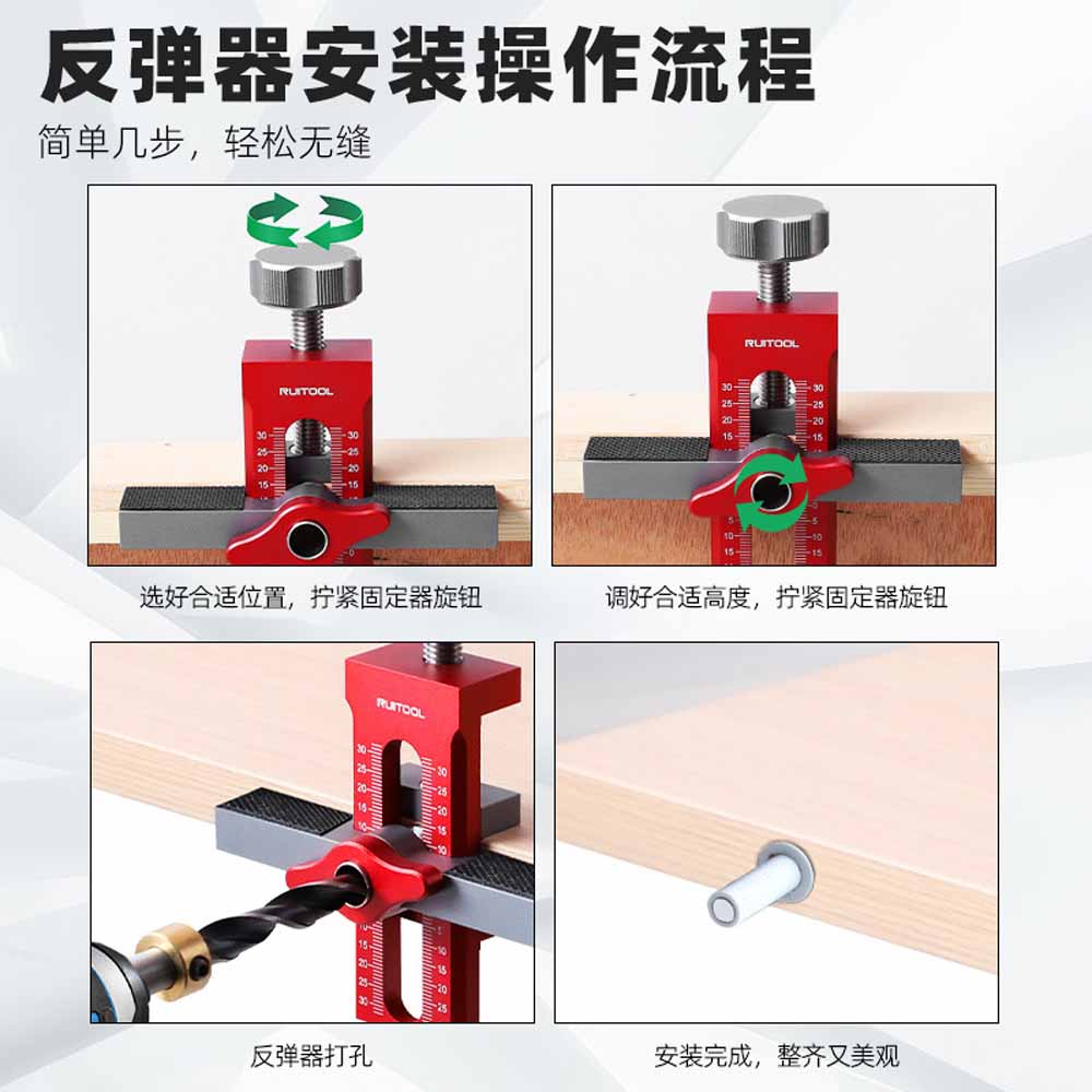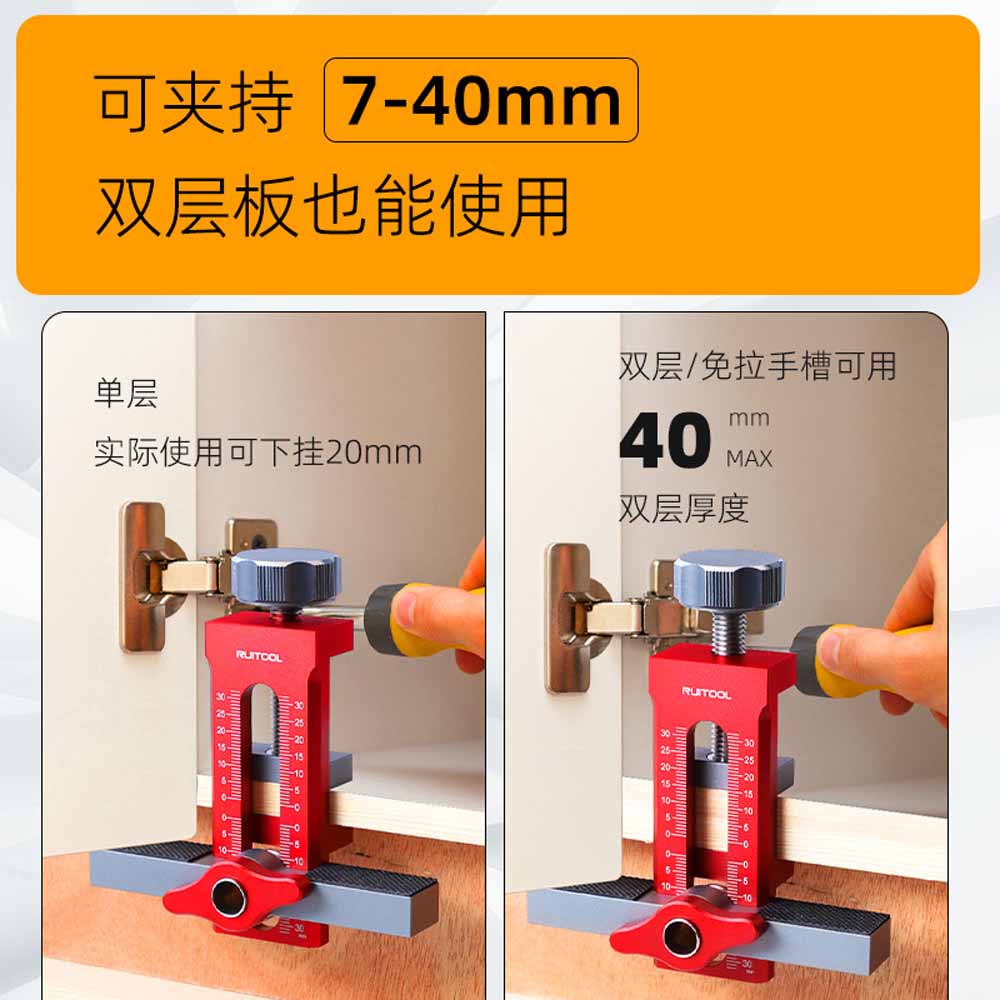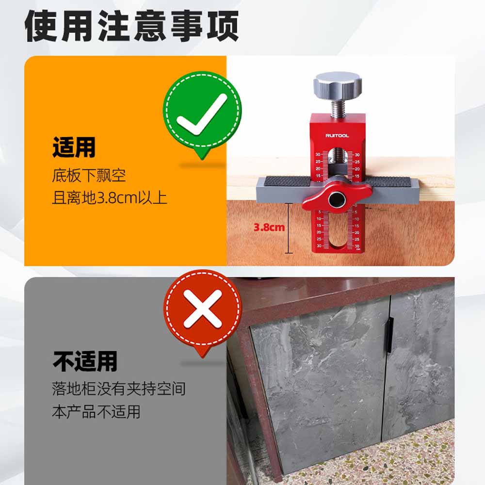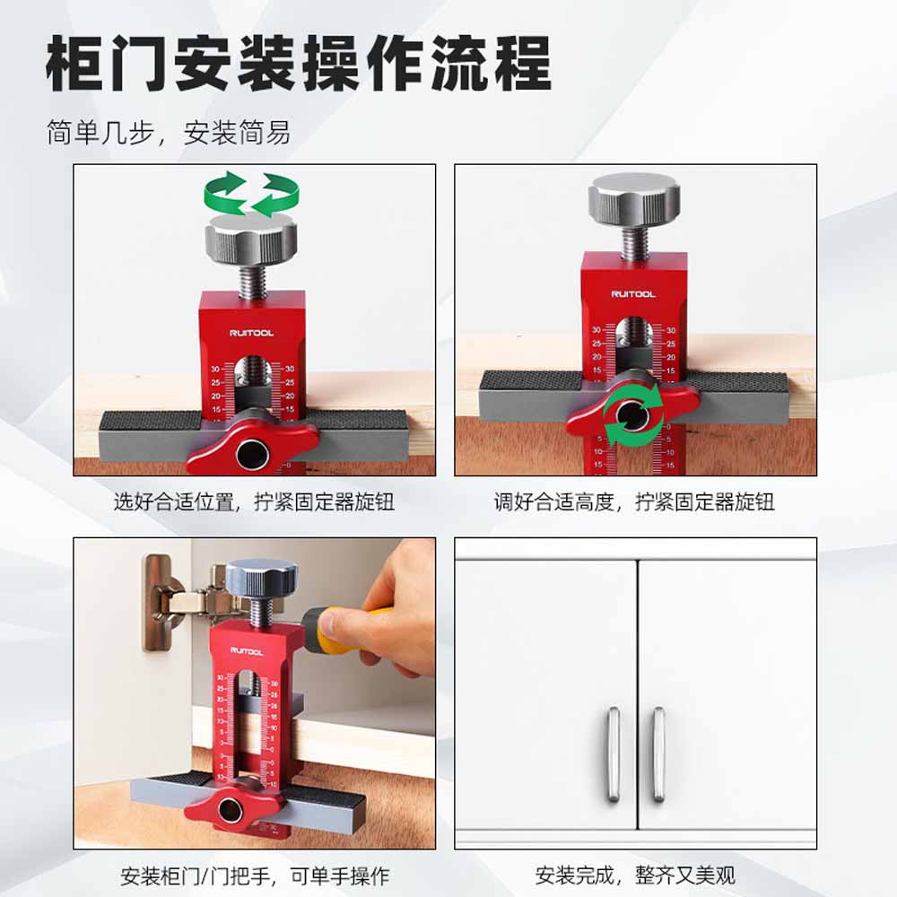 This aluminum alloy cabinet door installation tool is designed to simplify the installation of various cabinet door types. It is particularly useful for rebound-type doors, perforated doors, and hanging cabinet doors. The tool assists in lifting, leveling, and accurately positioning doors during installation, ensuring proper alignment and smooth operation. Its durable aluminum alloy construction provides stability and longevity. This tool is a valuable aid for DIY woodworking enthusiasts and professionals alike, helping to achieve a neat and professional finish on cabinet installations.